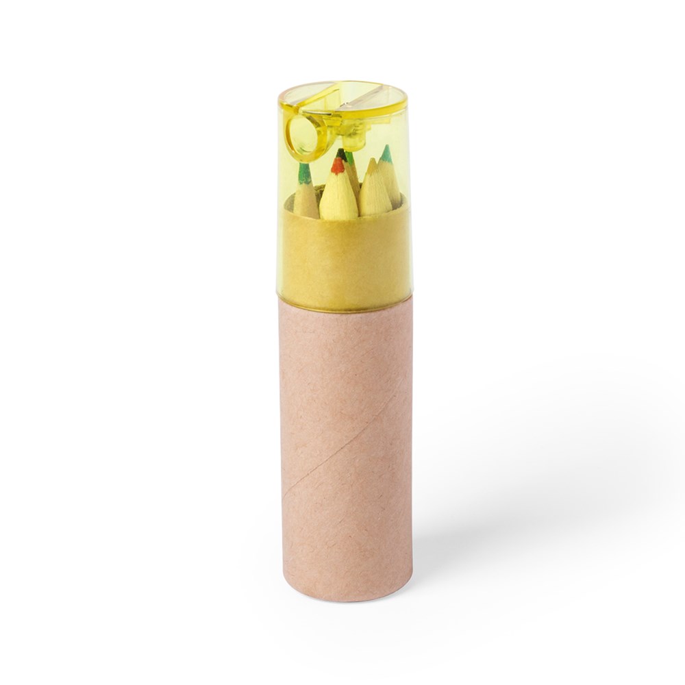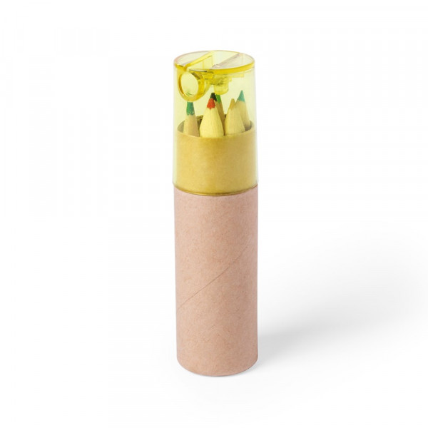 Set of 7 pieces in natural cardboard box with transparent hood in varied colors. Includes 6 wooden pencils in natural finish, with hexagonal body. Built-in pencil sharpener.