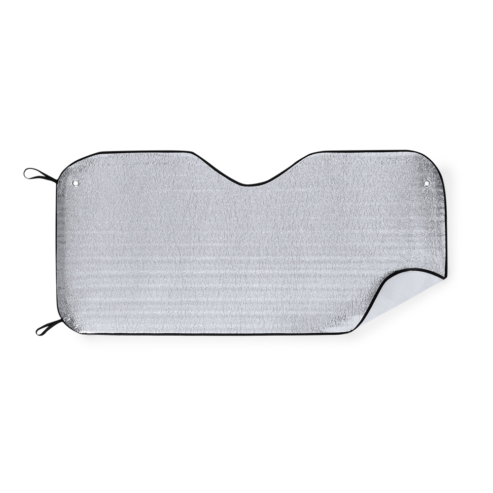 Sunshade with aluminium front and backside in foam. Size 130 x 60 cm, with non-woven piping and elastic bands in black. Including 2 metal eyelets and two suction cups for fitting to the windshield.