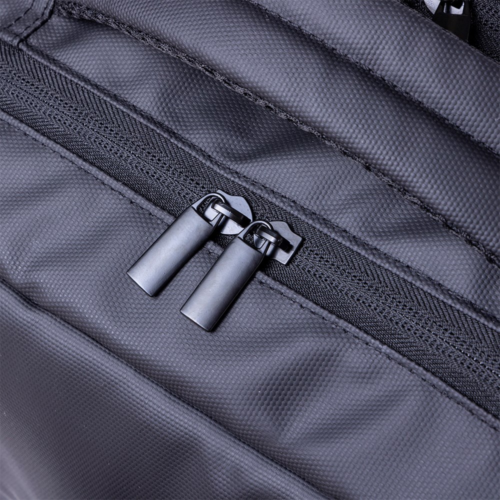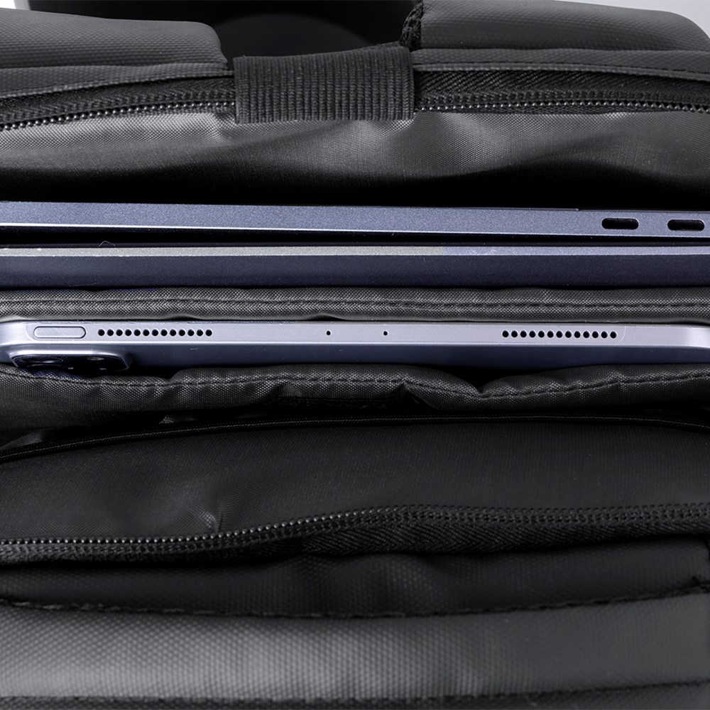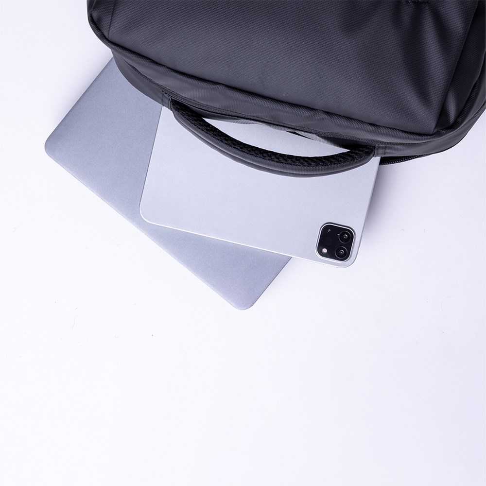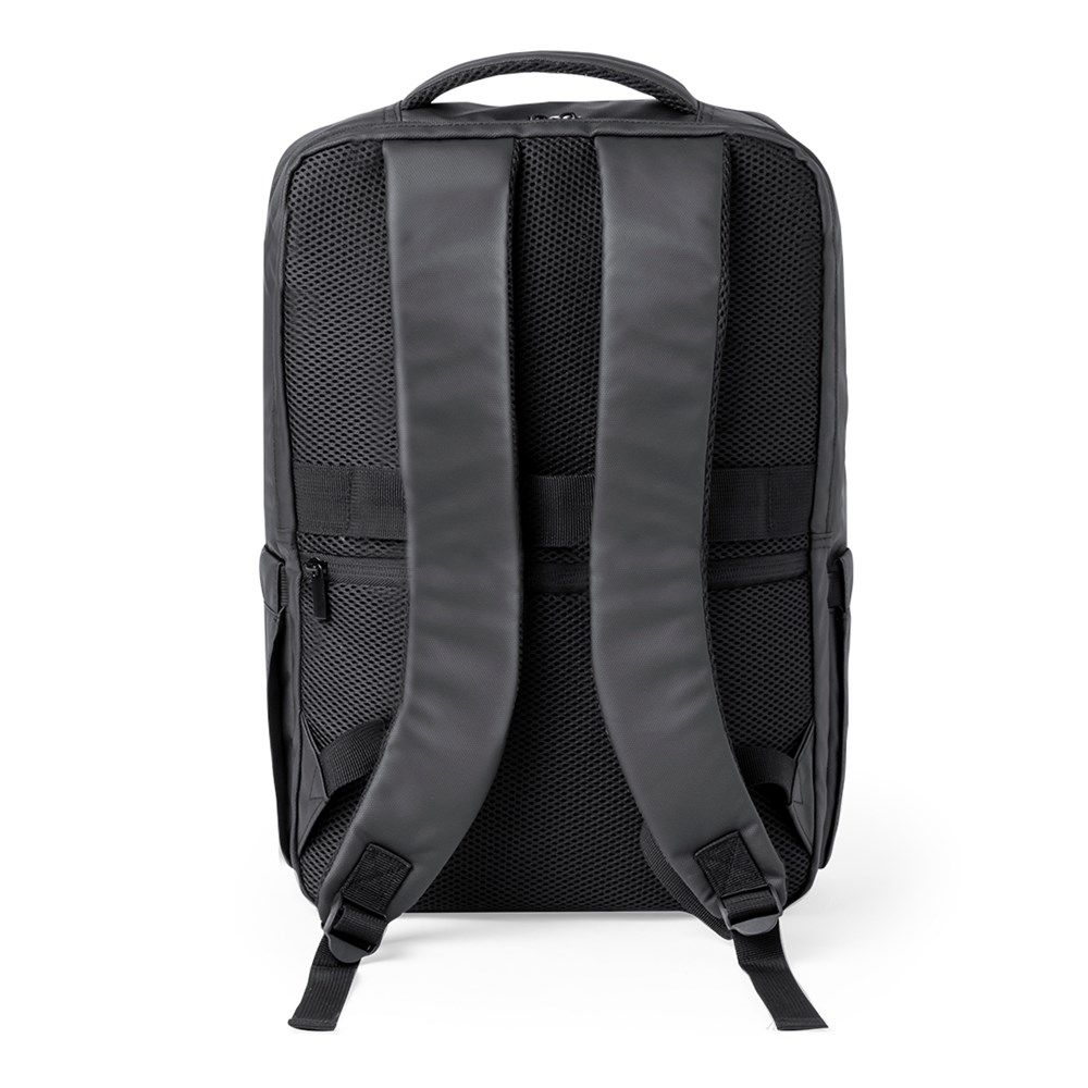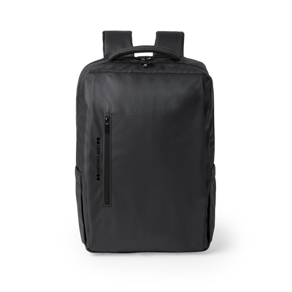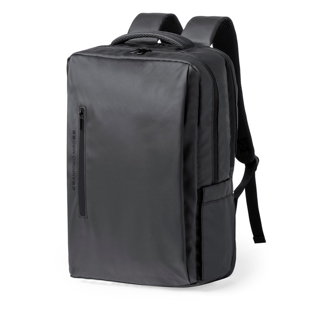 Premium quality Antonio Miró backpack in resistant leatherette with a sober design in black. With double zipper closure, front pocket and reinforced padded handle. With ergonomic padding on the back and shoulder straps, it includes a padded interior compartment for a laptop up to 15 inches and for tablets up to 10 inches. In addition, with an anti-theft pocket with zipper closure on the back. Interior covers for pens and smartphone. With brand logo on the front. Padded.