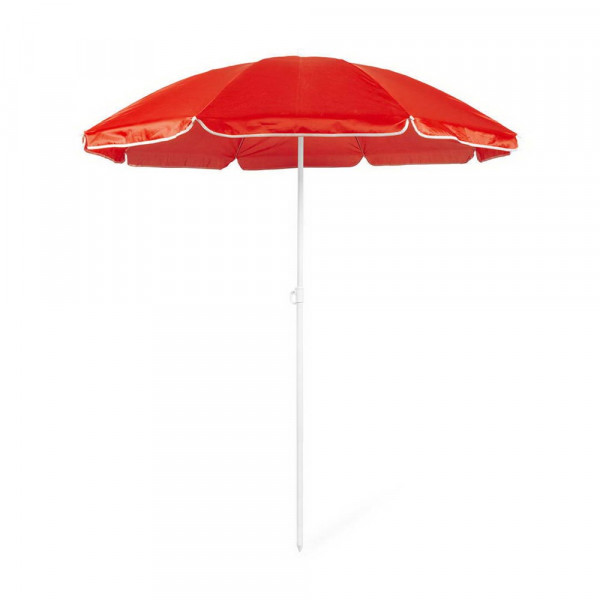 Beach umbrella of 8 panels in resistant nylon and in a varied range of bright tones. 150cm in diameter, with side skirts with piping and metal coated tubes in white color. Adjustable in height and presented in a PVC sleeve with shoulder strap.