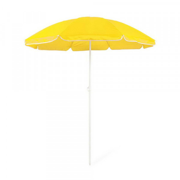 Beach umbrella of 8 panels in resistant nylon and in a varied range of bright tones. 150cm in diameter, with side skirts with piping and metal coated tubes in white color. Adjustable in height and presented in a PVC sleeve with shoulder strap.