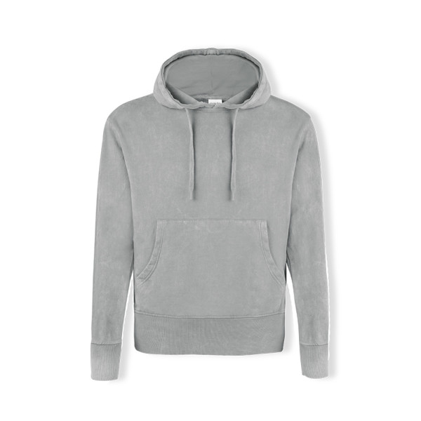 Unisex hooded sweatshirt with washed jeans effect, making each piece unique and unrepeatable. Kangaroo pocket, with extra wide elastic bands for a perfect fit. Contrast color in the elastic bands of cuffs and hem. Made in 100% combed cotton 280g/m2. Soft touch and modern cut, with adjustable flat strings and embroidered eyelets, avoiding the use of metal. Double stitching for durability and resistance to intensive wear. Easily removable label and available in sizes XS, S, M, L, XL and XXL.