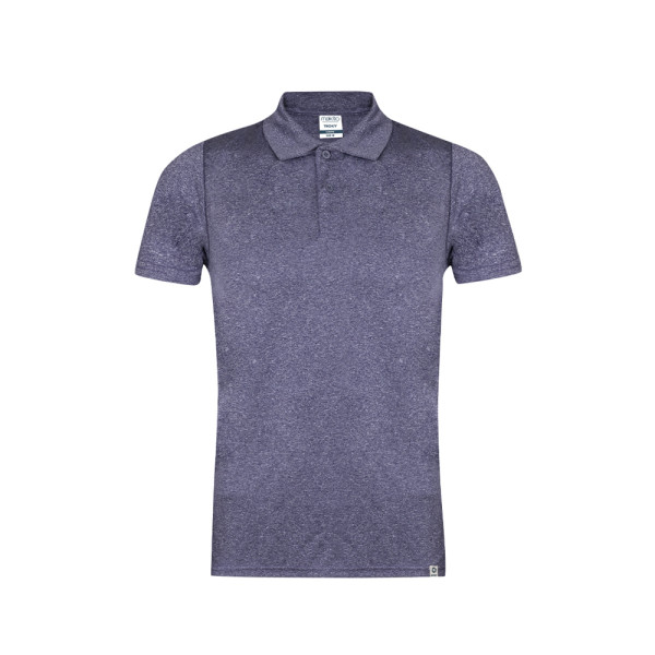 Unisex technical polo. Made from 100% recycled polyester fabric and melange effect colour. Its 150g/m2 fabric makes it a lightweight garment ideal for sports and everyday wear. Breathable fabric easy to wash and quick drying. Very soft feel and modern cut, with matching color two-button placket. Double stitched hem and sleeves for durability and resistance to intensive wear. With outer RPET label, indicative of a recycled origin product. Easily removable label and available in sizes XS, S, M, L, XL and XXL.