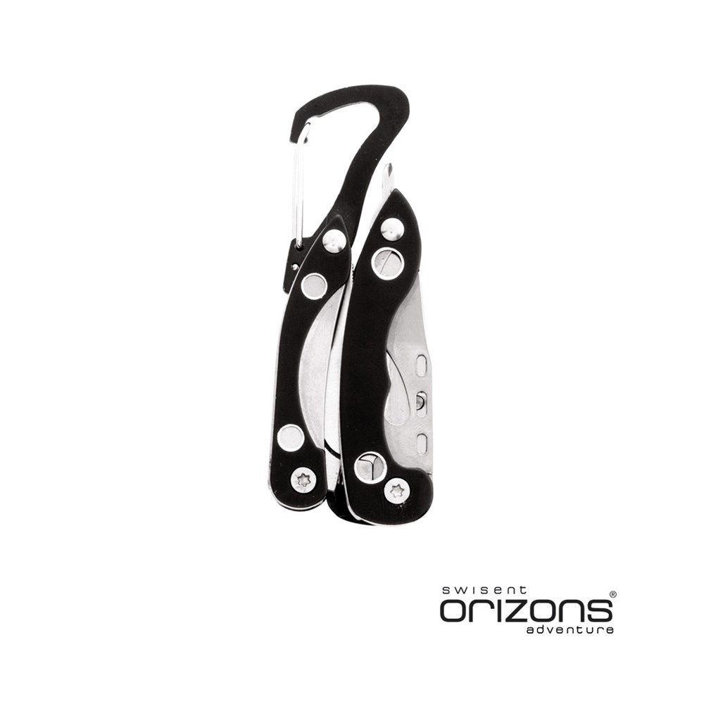 Multi-tool by Orizons with stainless steel accessories of 6 functions and aluminum handle in bright tones. With pliers, razor, can opener with flat-head screwdriver with bottle opener function, star tip detonator and carabiner. Presented in an attractive design box with the brand logo.