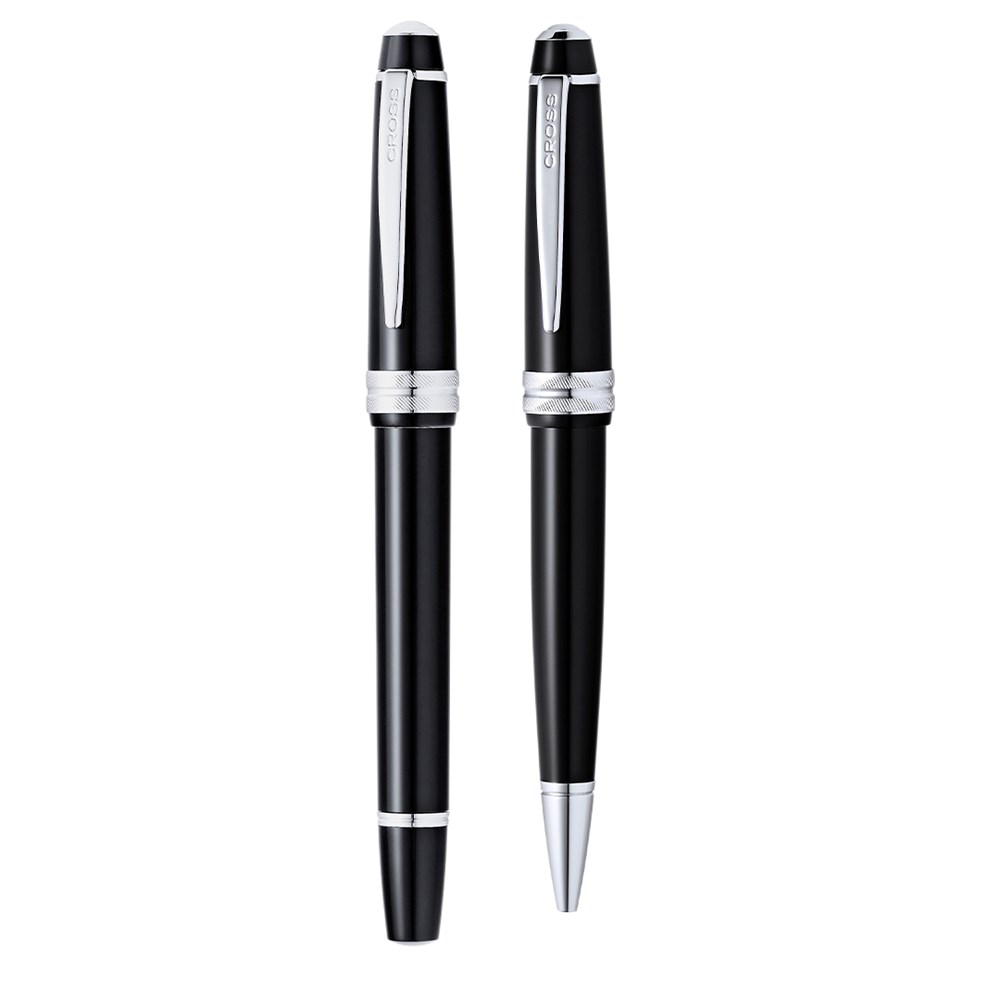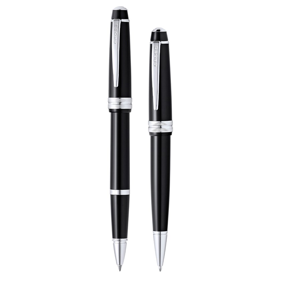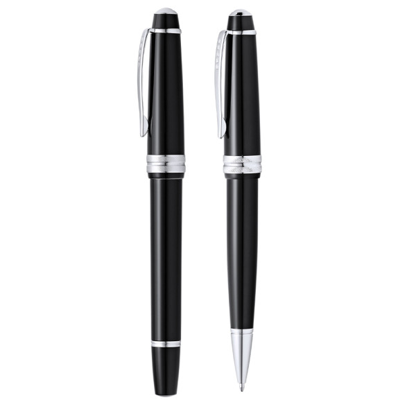 Set of ball pen and roller Cross Bailey Light, combining a high glossy resin with a polished chrome, metallic finish. Jumbo cartridge and black ink. Presented in an elegant, individual black case with brand logo and soft suede lining.