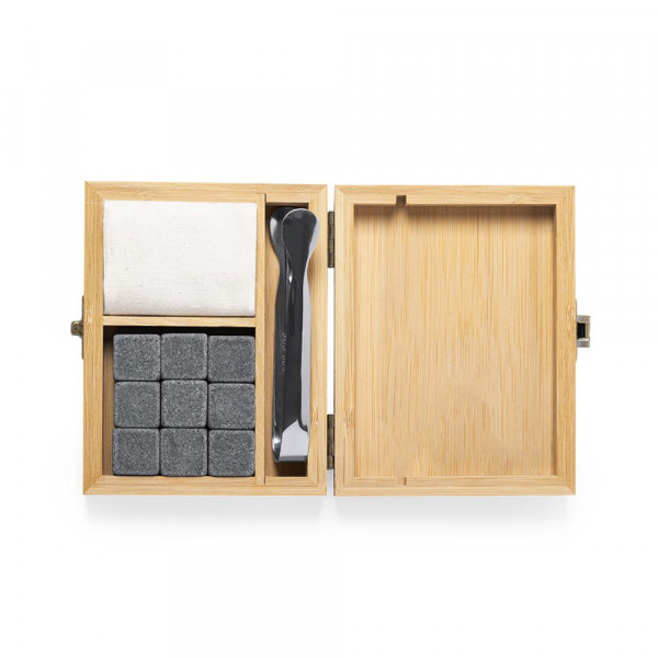 Set of 9 reusable ice cubes. Made of natural soapstone, keeping the drink cold without altering its properties by not diluting its content in water, as well as maintaining its original flavour. Including stainless steel tongs and cotton pouch. Presented in a bamboo case.