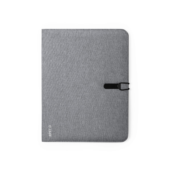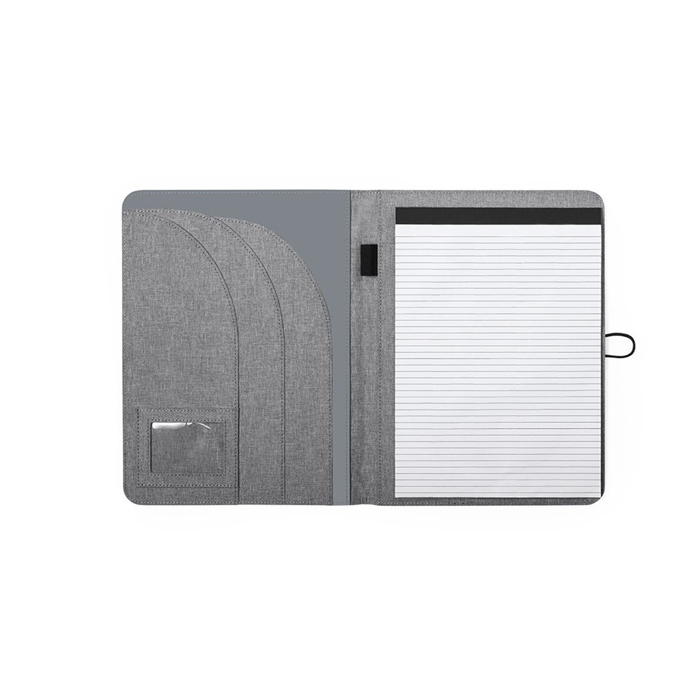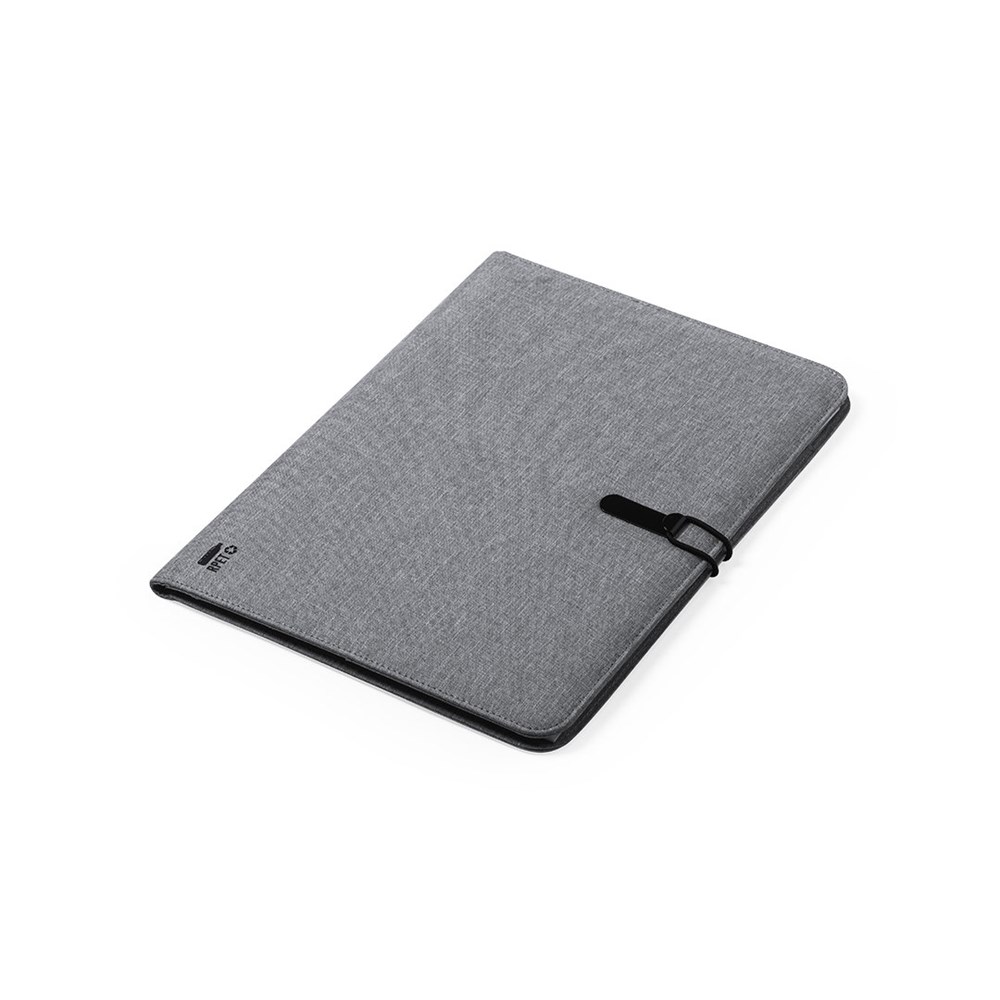 Elegant nature line folder A4 size. Made of resistant 600D RPET, melange effect, made from recycled plastic to encourage the reuse of plastic waste and contribute to the sustainability of the planet. Black color details. Including elastic band, metal closure designed for laser printing. Inside with detachable 20-page notepad in striped layout, 3 flap pockets, card holders and pen holder. RPET distinctive in corner.