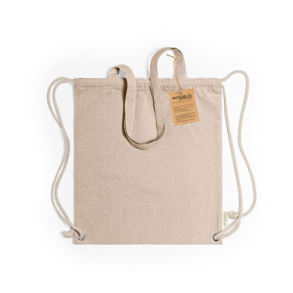 Nature line drawstring backpack bag in durable 140g/m2 recycled cotton, with matching 70 cm lenght carrying handles. Natural color cotton strings, with reinforced metal eyelets and recycled cotton label. Available in a wide range of colours. Resistance up to 9kg in weight.