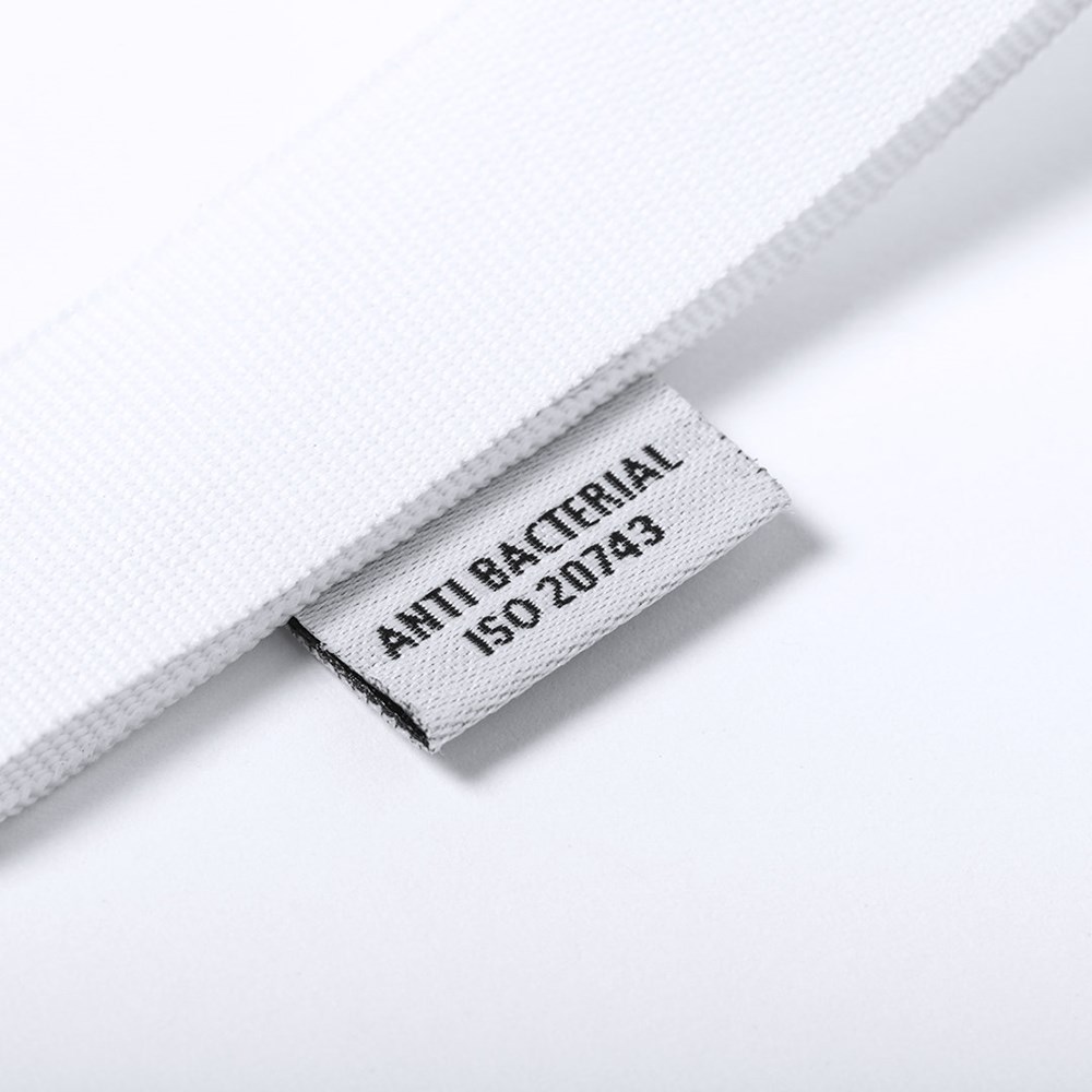 Antibacterial lanyard in white polyester with metal carabiner. Products with antibacterial treatments are able to drastically reduce the bacterial loads present on the surfaces of the materials, thanks to the incorporation of permanent static microbial agents, with high effectiveness in inhibiting and preventing bacterial contamination.Article according to the ISO 22196 standard, which determines the antibacterial activity in plastic materials and non-porous surfaces, which allows us to know the effectiveness of microbial inhibition that the additives have on the treated objects by means of a quantitative evaluation.
