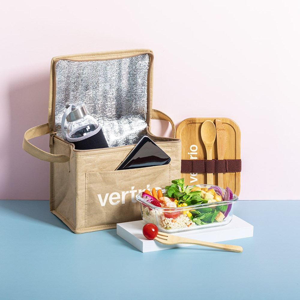 Nature line cooler bag with capacity for 6 cans. Made of laminated paper resistant to humidity, with isothermal interior finished in aluminium. Zipper and carring handle in matching color, with outside pocket for printing.