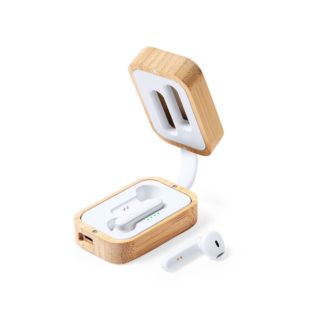 Nature line earphones, with Bluetooth® 5.0 connection and lithium battery. In elegant white finish and presented in a bamboo charging case. Ergonomically designed, including an integrated touch control button, with a matching charging base and LED charge indicator. Hands-free function and rechargeable, with micro USB cable included. Presented in attractive eco design box.
