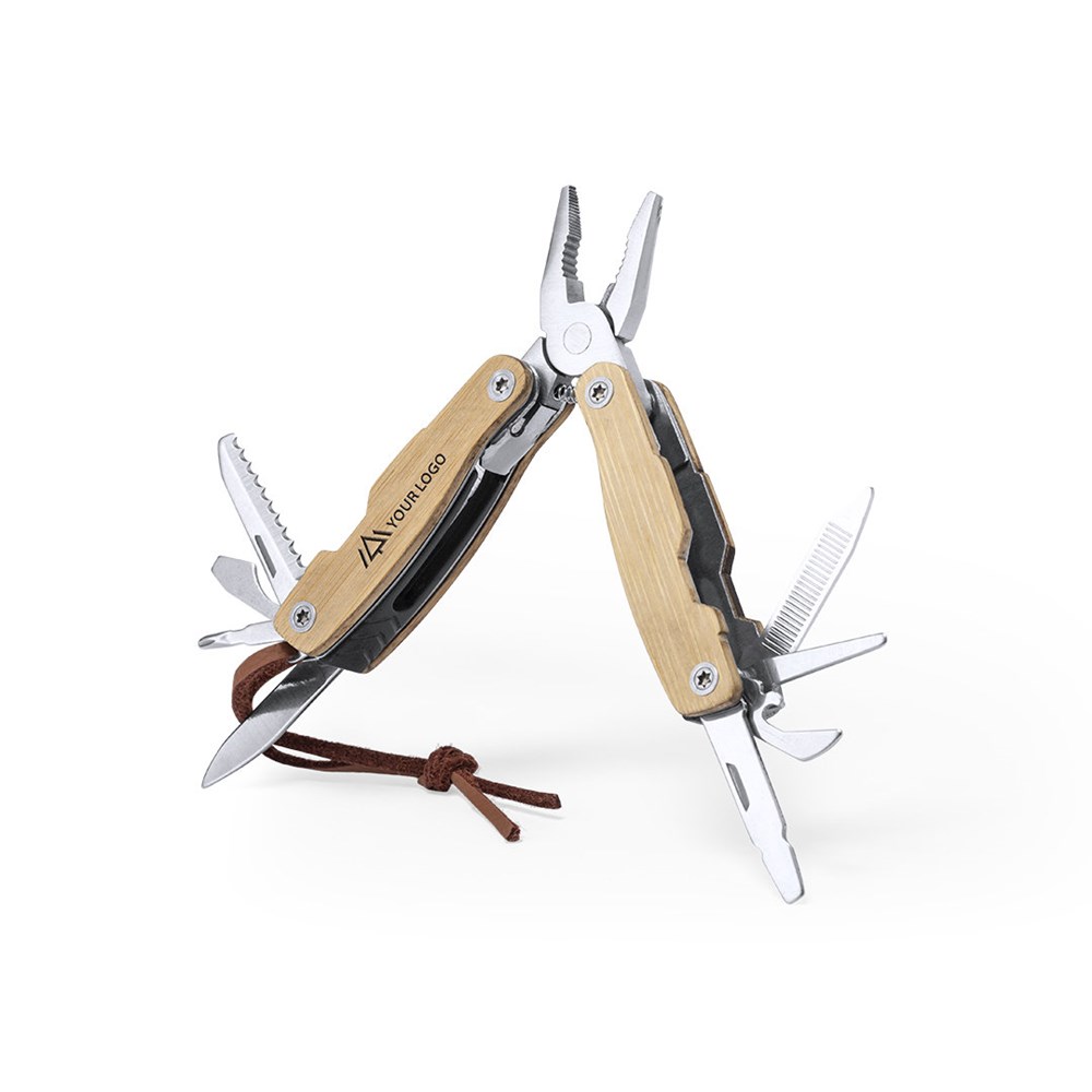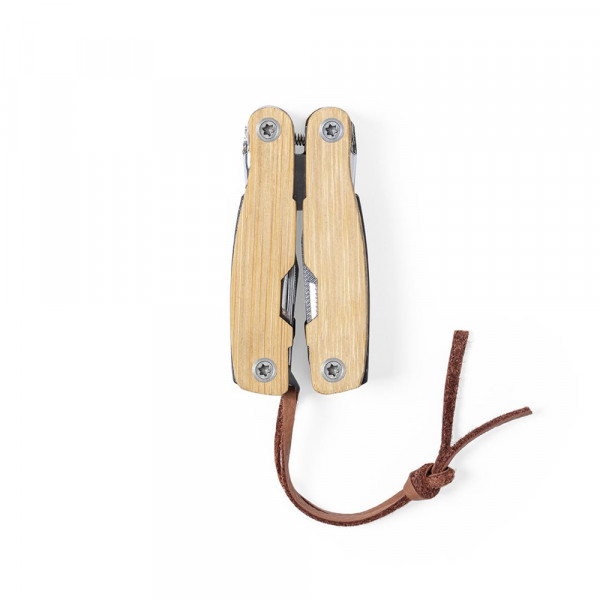 Multi-tool with resistant stainless steel body and bamboo handle, 12 functions. Includes knives and blades screwdrivers, files openers and pliers. With PU leather carrying strap and presented in an individual box.