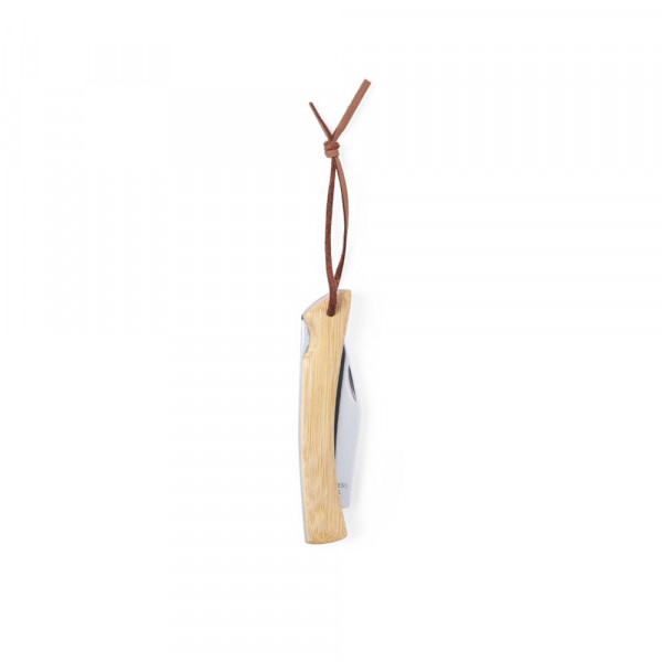 Nature line knife with stainless steel blade and resistant bamboo handle with safety lock. With PU leather carrying strap and presented in an individual box.