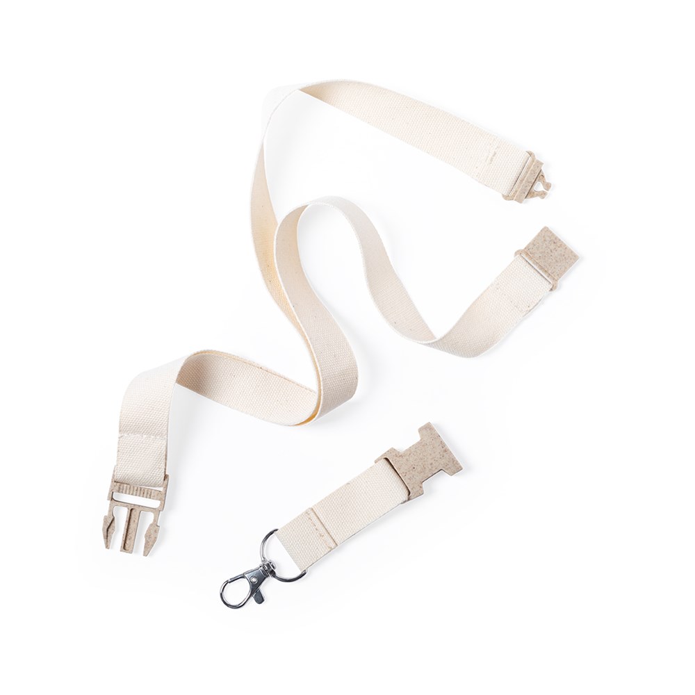Lanyard of nature line in cotton material. Buckle and neck safety lock in wheat straw/PP, to encourage the use of natural raw materials and reduce pollutant emissions. With metallic rotating carabiner and available in natural colour.