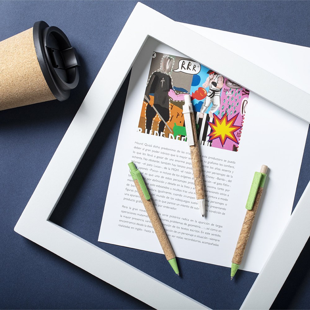 Nature line ball pen with push-button mechanism. Combination of body in natural cork and accessories in wheat cane and ABS , to encourage the use and recycling of raw materials, thus reducing pollutant emissions. Available in a wide range of colours, with blue ink. Wheat Straw logo on the top of the pen.