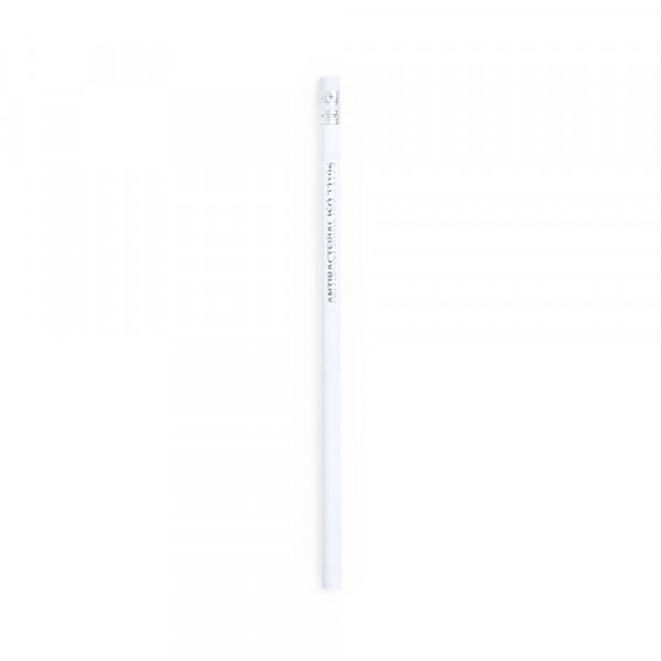 Wooden pencil with rounded body and anti-bacterial coating. Available in white color and including eraser. Unsharpened tip.Products with antibacterial treatments are able to drastically reduce the bacterial levels present on the surfaces of the materials, thanks to the addition of permanent static microbial agents, with high effectiveness in inhibiting and preventing bacterial contamination.Item according to the ISO 22196 standard, which determines the antibacterial activity in plastic materials and non-porous surfaces. This allows us to know the effectiveness of microbial inhibition that additives have on treated objects by means of a quantitave evaluation.