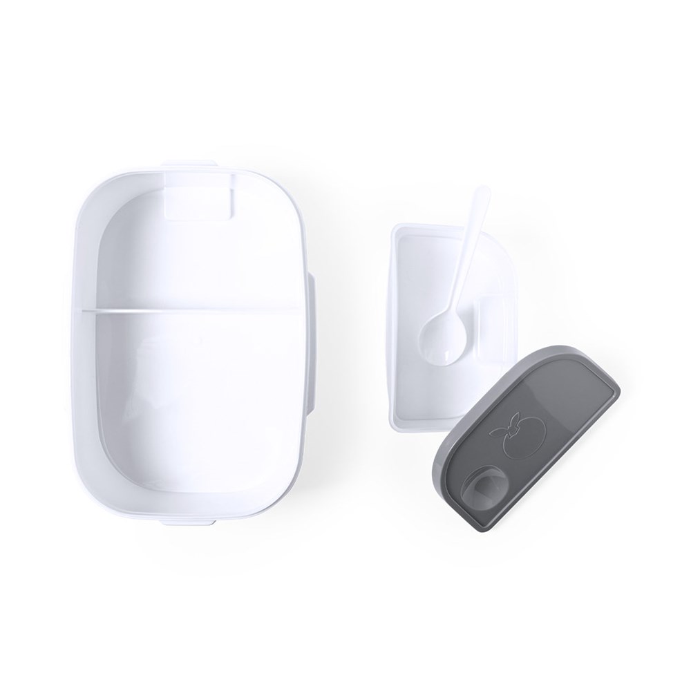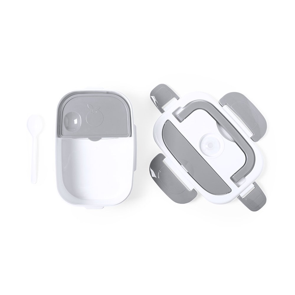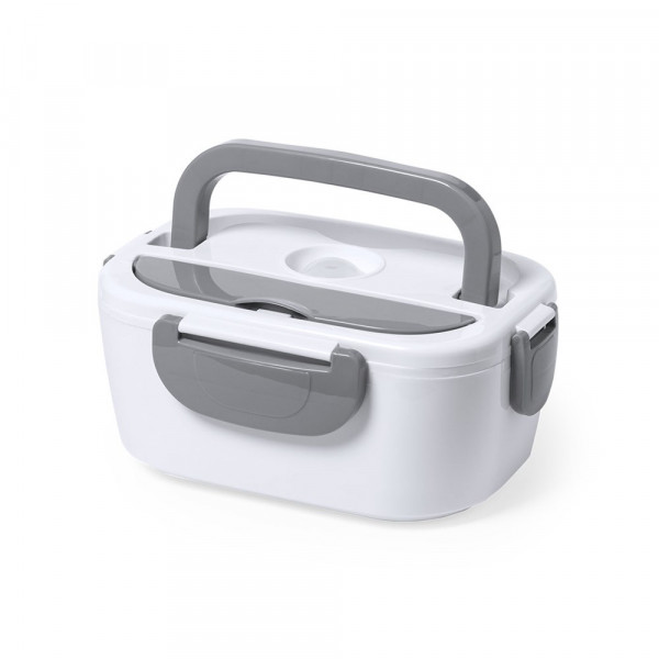 Electric lunchbox with 1l capacity . Manufactured in resistant BPA-free ABS and in a two-colour design. Includes practical carrying handle and waterproof lid with side safety locks. 2 main compartments and auxiliary compartment with hermetic closing. Spoon included, with power cable for European plug. Ideal for heating food at the office. Presented in an attractive design box.