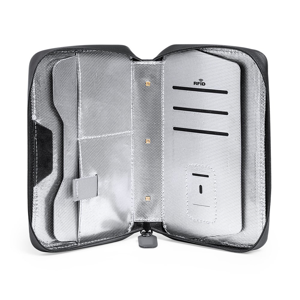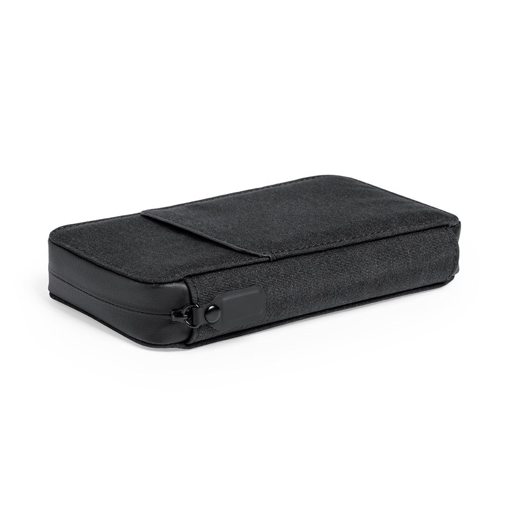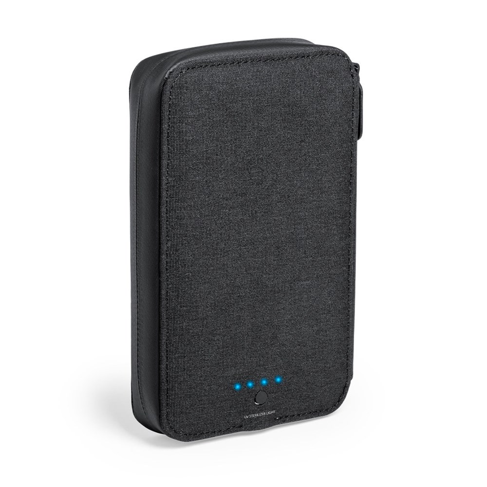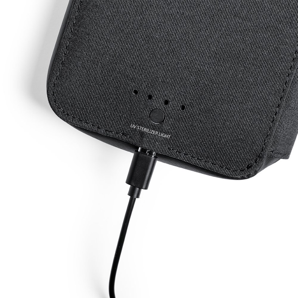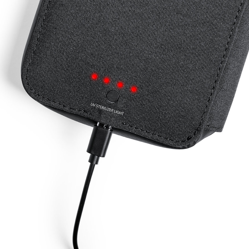 UV light type C organizer and sterilizer case, with RFID (Radio Frequency Identification) protection that keeps your identity transmission devices safe. Specially designed for the elimination of microorganisms and bacteria in smartphones and other everyday objects. Manufactured in resistant polyester 600D denim finish, with magnetic security lock on the puller for a safe use of the device. Includes 4 inner card holders + outer pocket. Presented in an attractive individual design box. LED bulb power 1.2W and wavelength 275nm. Sterilization time with auto-off function of 1 and 3 minutes. User manual available in Spanish and English. CE, RoHS and germicidal effectiveness certification available. For proper use of the product, avoid contact with skin and eyes.