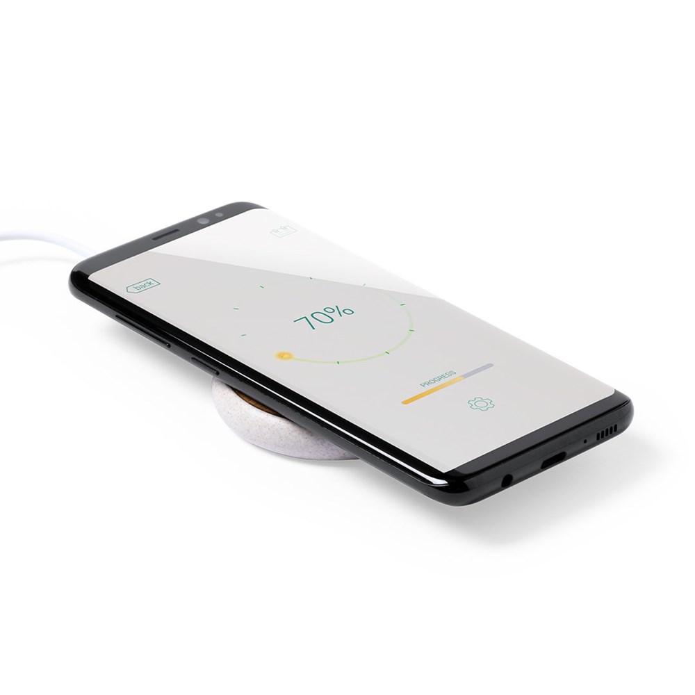 Wireless charger with a circular design. Charging surface in bamboo and shell made of wheat straw, in order to encourage the use of natural raw materials and reduce contaminant emissions. Led indicator, including micro USB charging cable and compatible with devices equipped with wireless charging technology. Safety protection to avoid overheating, overcharging and short-circuiting. Presented in an attractive box of nature design.