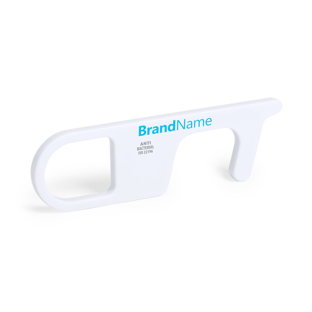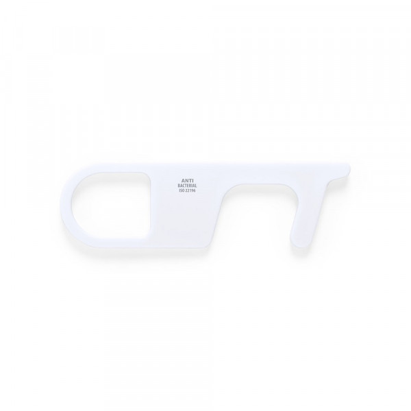 Hygienic, antibacterial and anti-contact safety key ring, made of resistant ABS with a solid finishing. Specially designed to avoid touching public usage surfaces with your hands (door handles, switches, public use taps, ATMs…). With comfortable cut-out for the finger and presented in an individual bag. Recommended for pad printing.Products with antibacterial treatments are able to drastically reduce the bacterial levels present on the surfaces of the materials, thanks to the addition of permanent static microbial agents, with high effectiveness in inhibiting and preventing bacterial contamination.Item according to the ISO 22196 standard, which determines the antibacterial activity in plastic materials and non-porous surfaces. This allows us to know the effectiveness of microbial inhibition that additives have on treated objects by means of a quantitave evaluation.