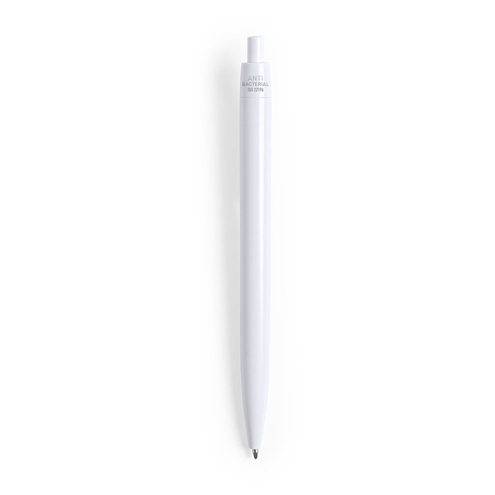 Antibacterial ball pen with push-up mechanism. Monochromatic design in a wide range of bright tones with a glossy finish, especially designed for pad printing. Blue ink refill. Products with antibacterial treatments are able to drastically reduce the bacterial levels present on the surfaces of the materials, thanks to the addition of permanent static microbial agents, with high effectiveness in inhibiting and preventing bacterial contamination. Item according to the ISO 22196 standard, which determines the antibacterial activity in plastic materials and non-porous surfaces. This allows us to know the effectiveness of microbial inhibition that additives have on treated objects by means of a quantitave evaluation.