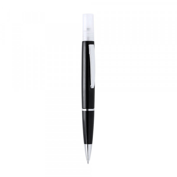 Sterilizer pen with rechargeable sprayer and protective hood. Made of resistant ABS with shiny finish. Elegant metal clip and comfortable handle. Blue ink. Sprayer capacity 3 ml. Liquid not included. Available in a wide range of colours.