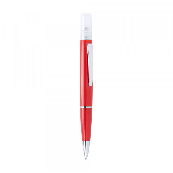 Sterilizer pen with rechargeable sprayer and protective hood. Made of resistant ABS with shiny finish. Elegant metal clip and comfortable handle. Blue ink. Sprayer capacity 3 ml. Liquid not included. Available in a wide range of colours.