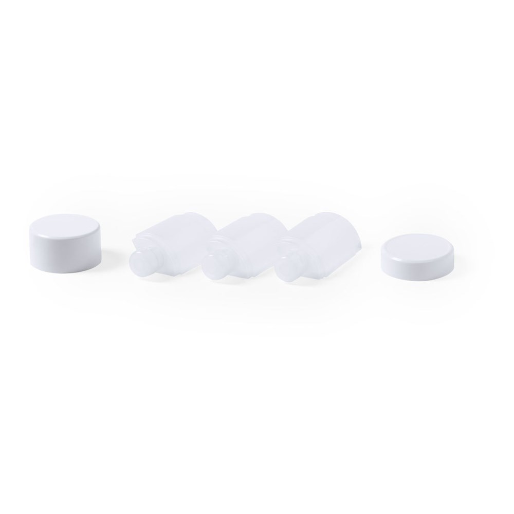 Travel set of 3 accessories in resistant PP material. Including 3 bottles with watertight closure. Presented in an eye catching case.