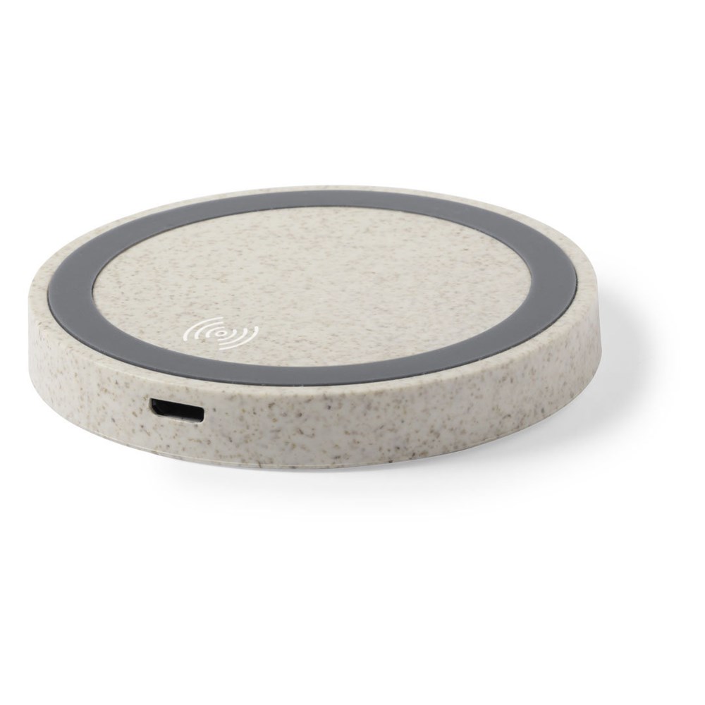 Nature line wireless charger. Shell inwheat straw, to encourage the use of natural raw materials and reducing contaminant emissions. With non-slip base and LED indicator for charging status. Compatible with smartphones with wireles charging technology and presented in an attractive, eco design box.