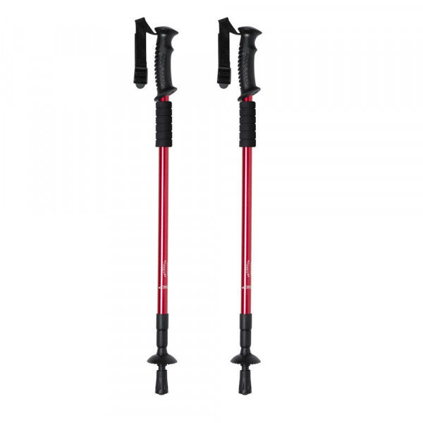 Set of folding poles with aluminum body, anti-shock mechanism and soft foam hand rests. Comfortable ergonomic, adjustable security belt and snow accessory. Reinforced ground contact surface. Presented in an individual bag with shoulder strap. Poles available in 3 colors.