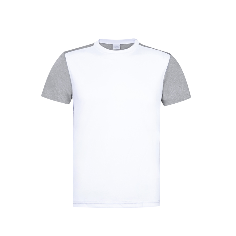Technical t-shirt for adult in breathable polyester/elastane 135g/m2. In an elegant two color design, with body in white color, backside and details in grey. Available in sizes S, M, L, XL, XXL. White color especially manufactured for sublimation printing.