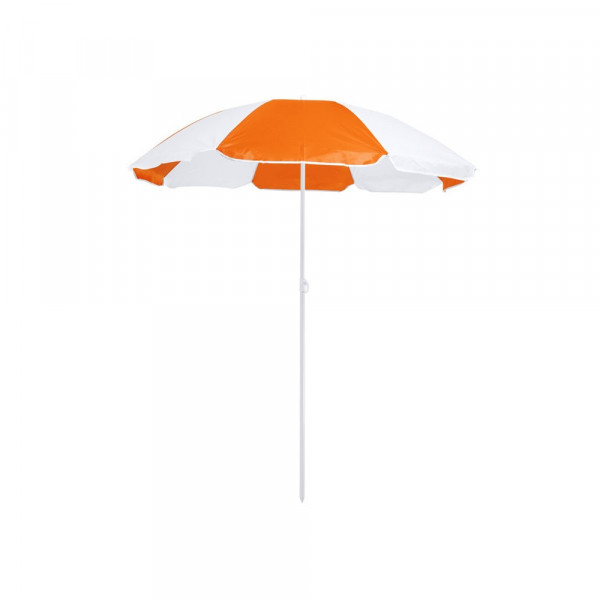 Beach umbrella of 8 panels in resistant nylon and in 2 color combination. 150cm in diameter, with side skirts with piping and metal coated tubes in white color. Adjustable in height and presented in a PVC sleeve with shoulder strap. Available in a wide range of combined colors.