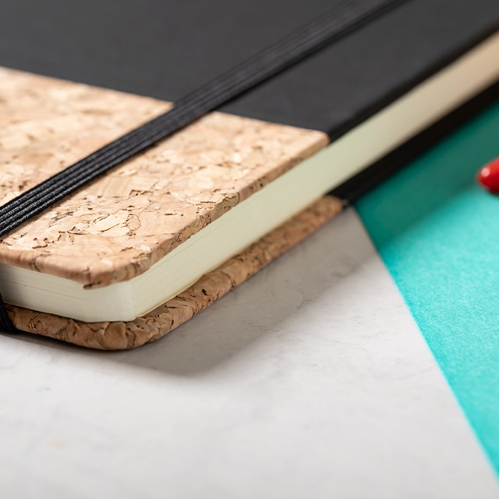 Nature line notepad in a combination of natural cork and PU leather with hard covers. 100 blank sheets with natural finish, elastic band for fastening and matching fabric bookmark. Available in a wide range of colours.