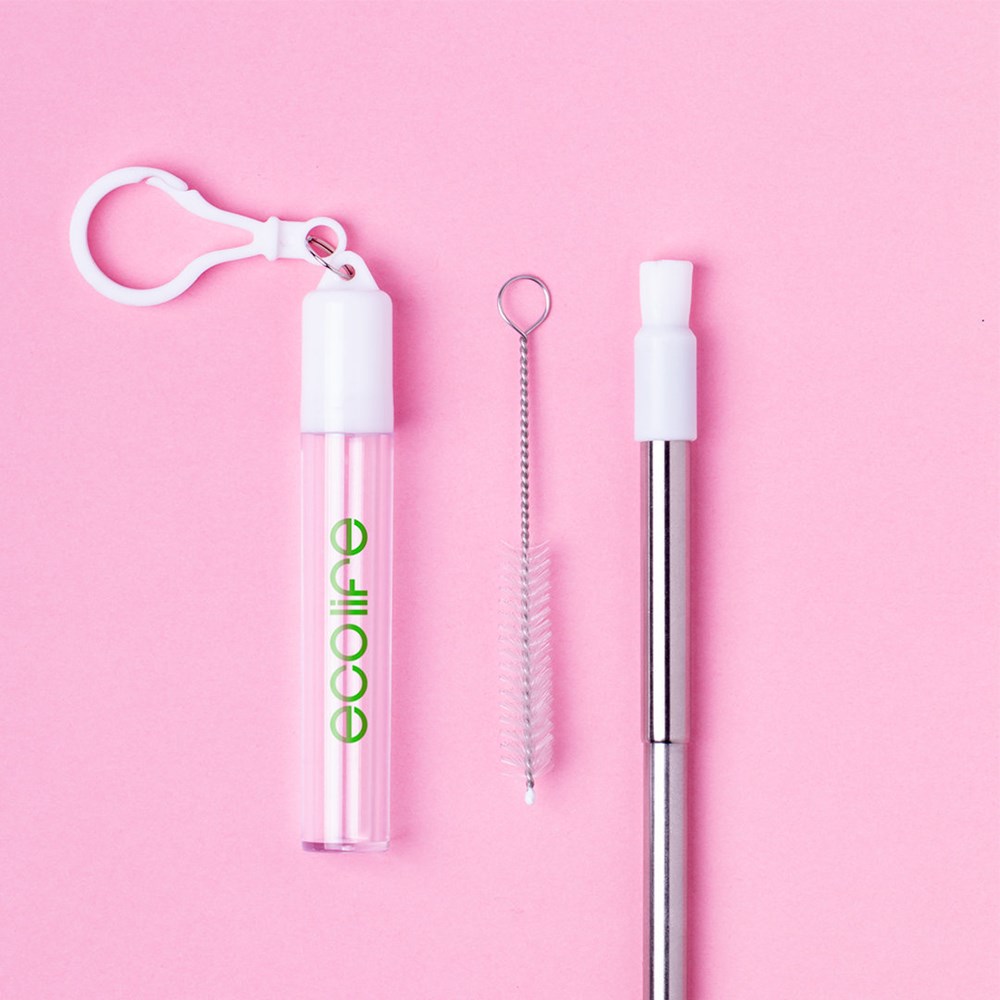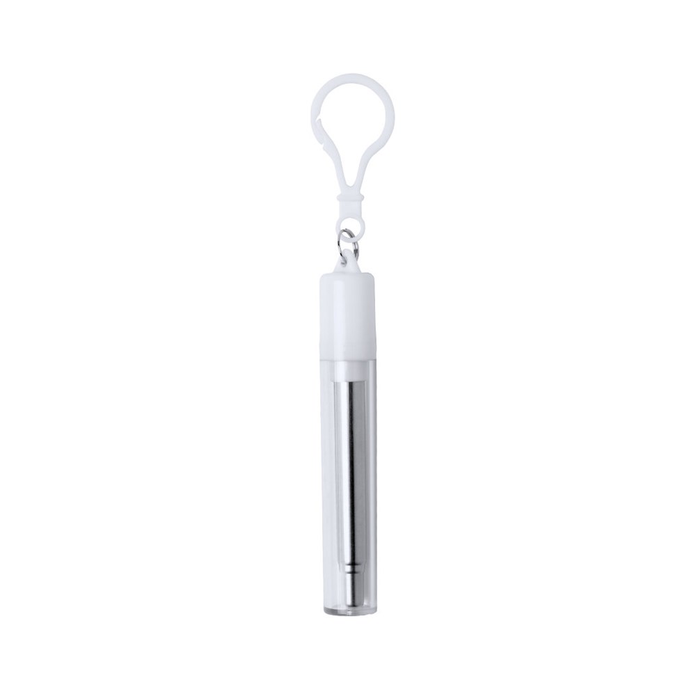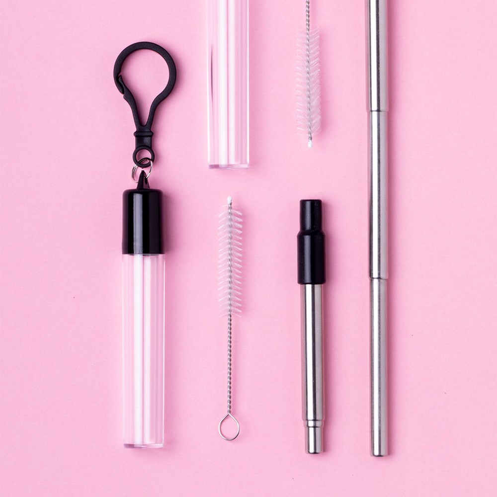 Reusable and extensible straw in stainless steel material with silicone tip. Including cleaning accessory and presented in a transparent case with carrying accessory.