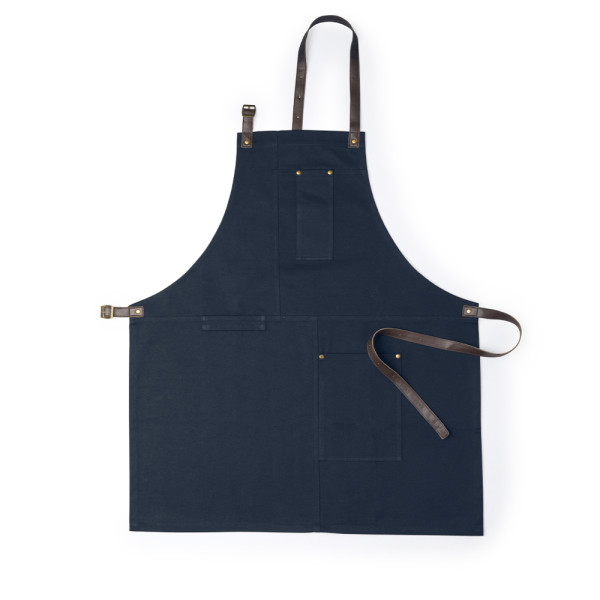 Pro apron in high quality, in resistant cotton canvas material of 340g/m2. Fitting under the knee, with neck and waist straps in resistant PU leather, with buckle adjustments and reinforced with metal rivets. Including many pockets for several utensils, with reinforced stitching.