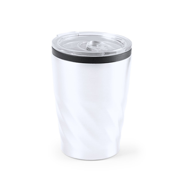 Tabletop glass made of stainless steel with a capacity of 350ml. Body with bevelled design, with black ring. With original transparent measuring cap and easy-opener. It is ideal for your desk, table, or any surface where you can enjoy your favorite drink.