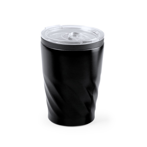 Tabletop glass made of stainless steel with a capacity of 350ml. Body with bevelled design, with black ring. With original transparent measuring cap and easy-opener. It is ideal for your desk, table, or any surface where you can enjoy your favorite drink.