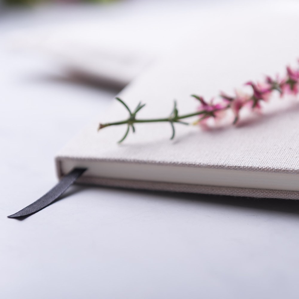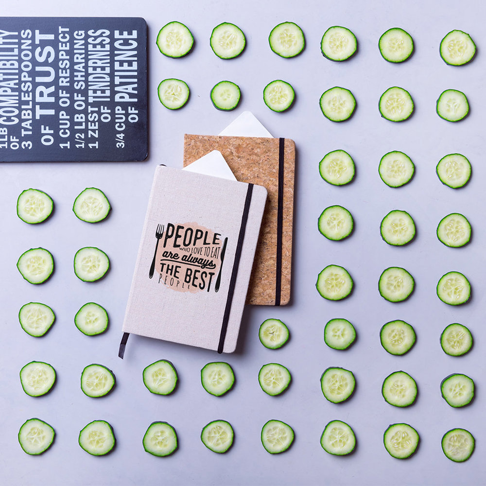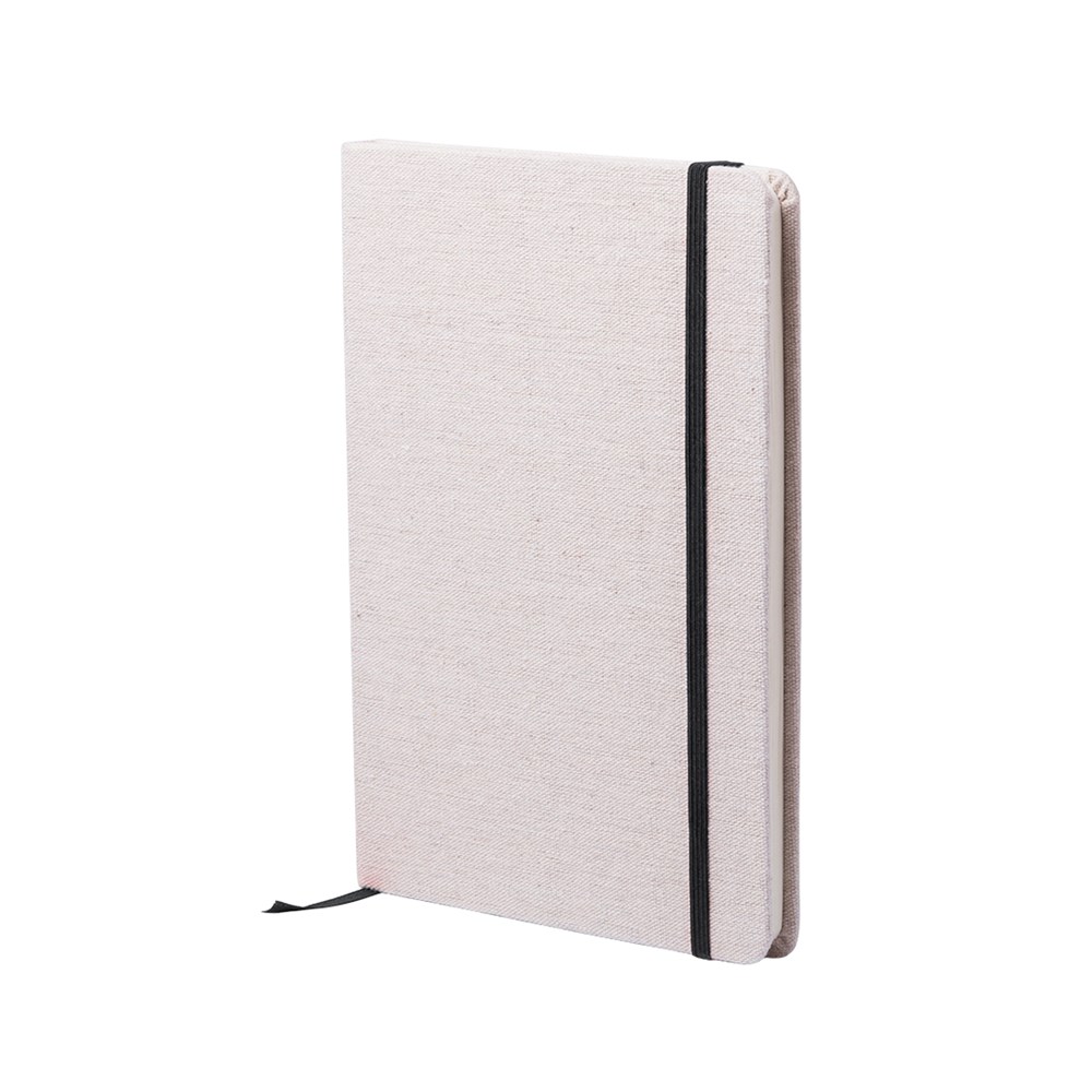 Notepad in natural materials. Covers in soft, natural color cotton. With elastic closure band and bookmark in matching, eye-catching colors. Including 80 plain sheets.