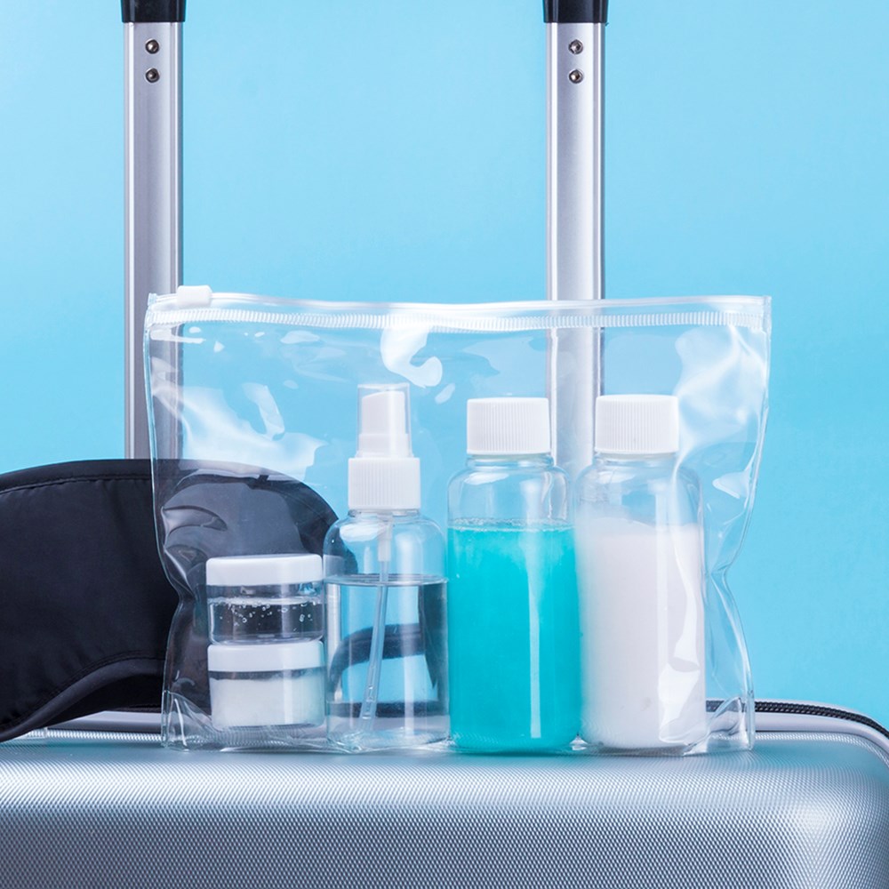Travel set/ beauty bag of 5 accessories in transparent design. Includes two jars for gel and shampoo with screw-on cap, perfumer and two jars for cream Presented in a PVC case with hermetic seal.