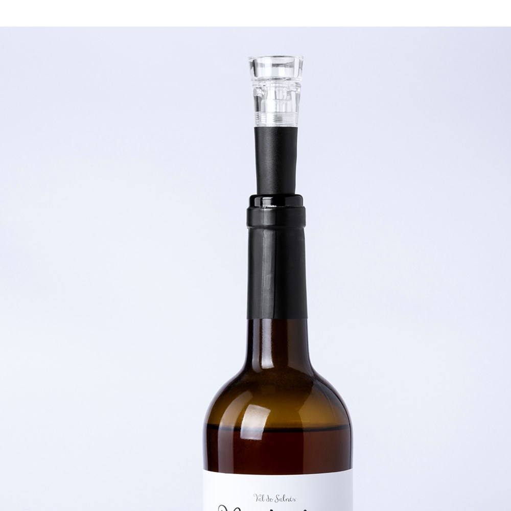 Vaccum lid for wine bottles in an elegant, black color and transparent design. Upper side of the lid in metal for laser or pad printing. Presented in an individual box.