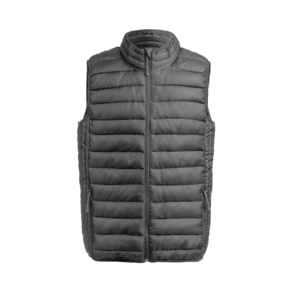 Vest in warm and soft 100% polyester material. In extra light, compact, waterproof and windproof material, with inner padding. Zip fastening with strap on puller and large side pockets. Zip collar with flap and side pockets with pull tabs. Includes handy carrying pouch. Available in sizes S, M, L, XL, XXL.