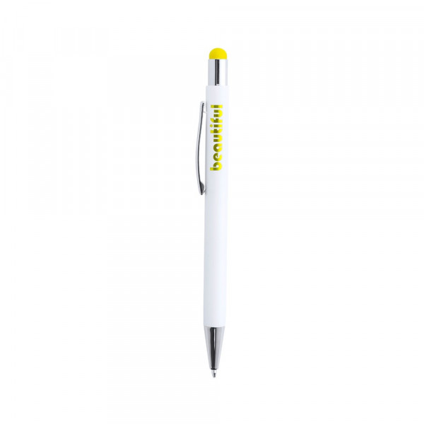 Pointer ball pen with push-up mechanism and body in an elegant, aluminum, matt white color design. Pointer in a wide range of vivid colors, in matching color with the inner tone and with chromed details. Outer surface especially designed for laser printing: when engraving the logo, the inside color of the item is shown. Jumbo cartridge and blue ink.
