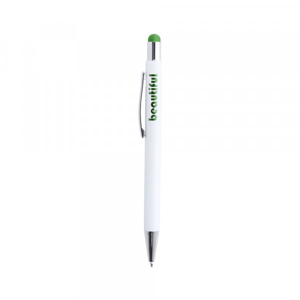 Pointer ball pen with push-up mechanism and body in an elegant, aluminum, matt white color design. Pointer in a wide range of vivid colors, in matching color with the inner tone and with chromed details. Outer surface especially designed for laser printing: when engraving the logo, the inside color of the item is shown. Jumbo cartridge and blue ink.