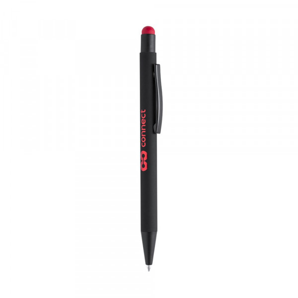 Push-button mechanism stylus pen with solid black finish body and push-button in a variety of colors. Metallic, black color clip. Especially designed for laser engraving, including a special coating for your logo to be properly engraved in matching color with the pointer. Jumbo cartridge and blue ink.