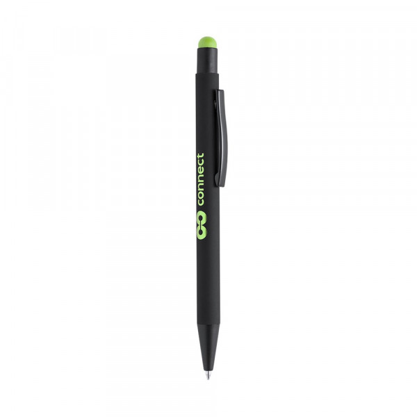 Push-button mechanism stylus pen with solid black finish body and push-button in a variety of colors. Metallic, black color clip. Especially designed for laser engraving, including a special coating for your logo to be properly engraved in matching color with the pointer. Jumbo cartridge and blue ink.