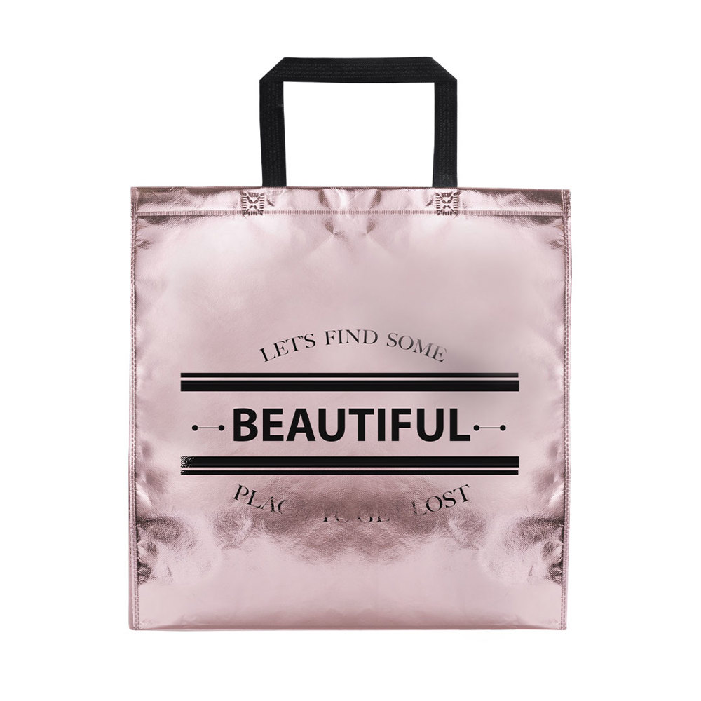 Bag in non-woven with lamination material and metallic finishing. Available in golden, silver and golden pink colors. With medium size, 42 cm, reinforced handles. Heat sealing finishing, with reinforced gussets and piping. Resistance up to 7kg weight.