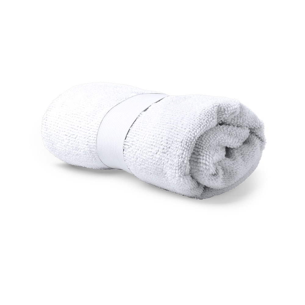 Absorbent microfibre towel. Size 40x90 cm, in 160gr/m2 microfibre material. Available in a wide range of colors, with an elastic band in white color for printing.