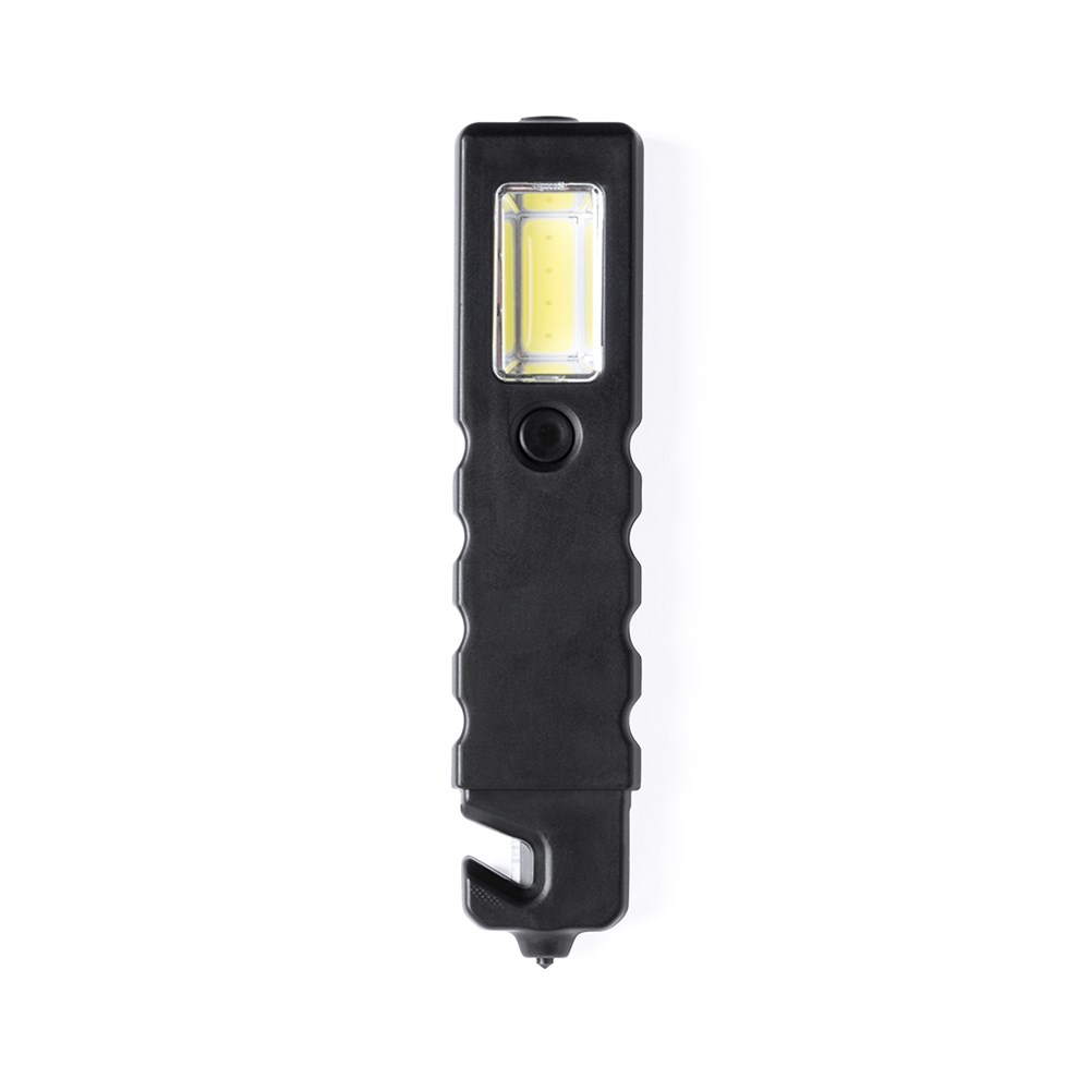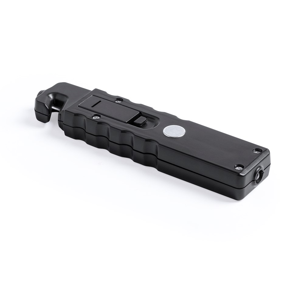 3-in-1 emergency hammer with LED flashlight and 4 COB lights with 3 illumination modes. With magnetic surface and belt cutter blade.