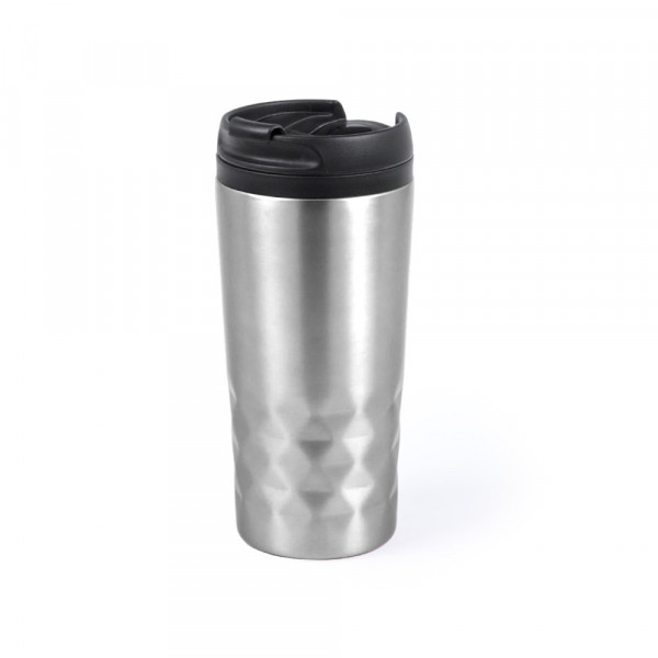 Stainless steel table-top cup with a capacity of 310ml. With easy-open dispenser lid and soft foam padded base. It is ideal for your desk, table, or any surface where you can enjoy your favorite drink. With original glossy finish and diamond design.