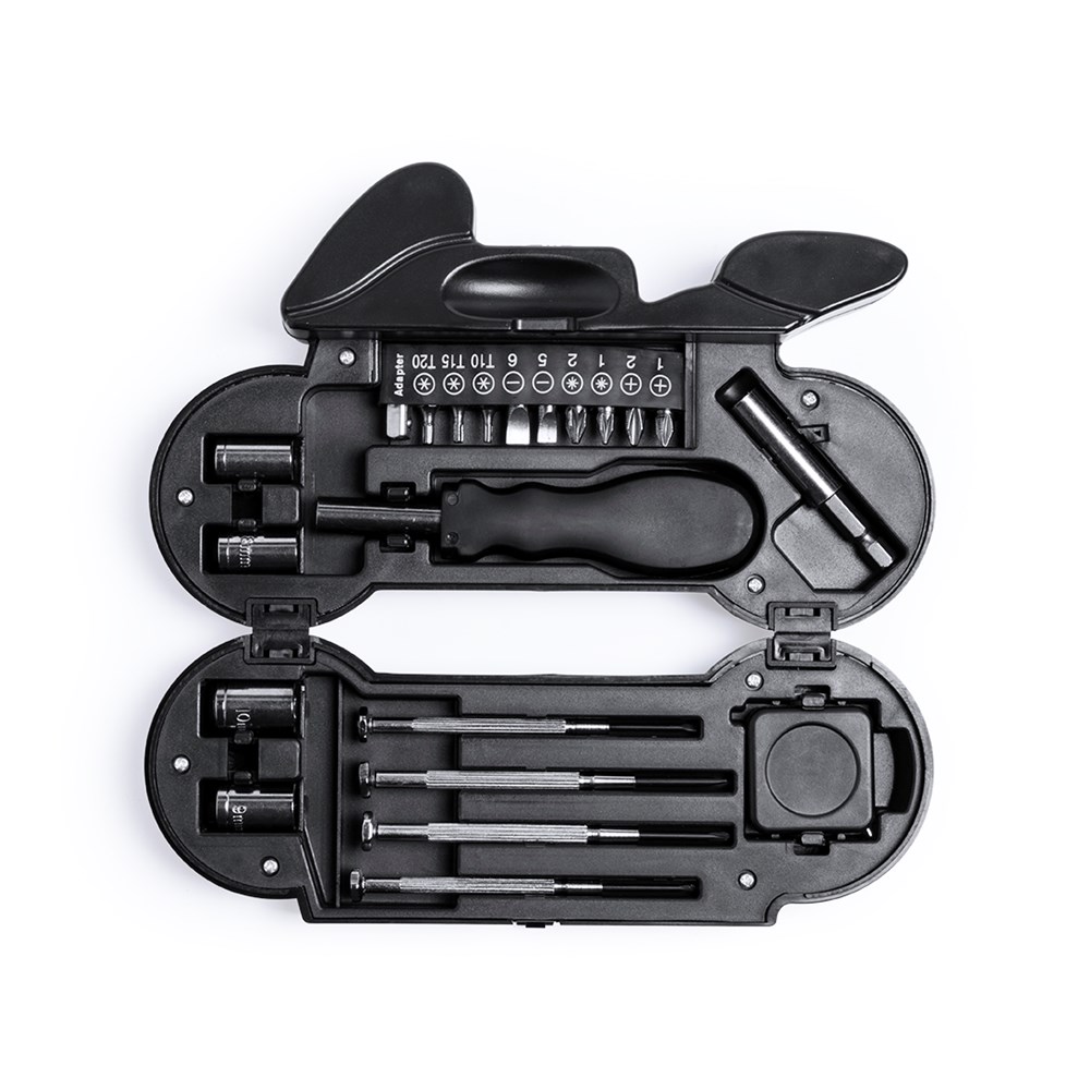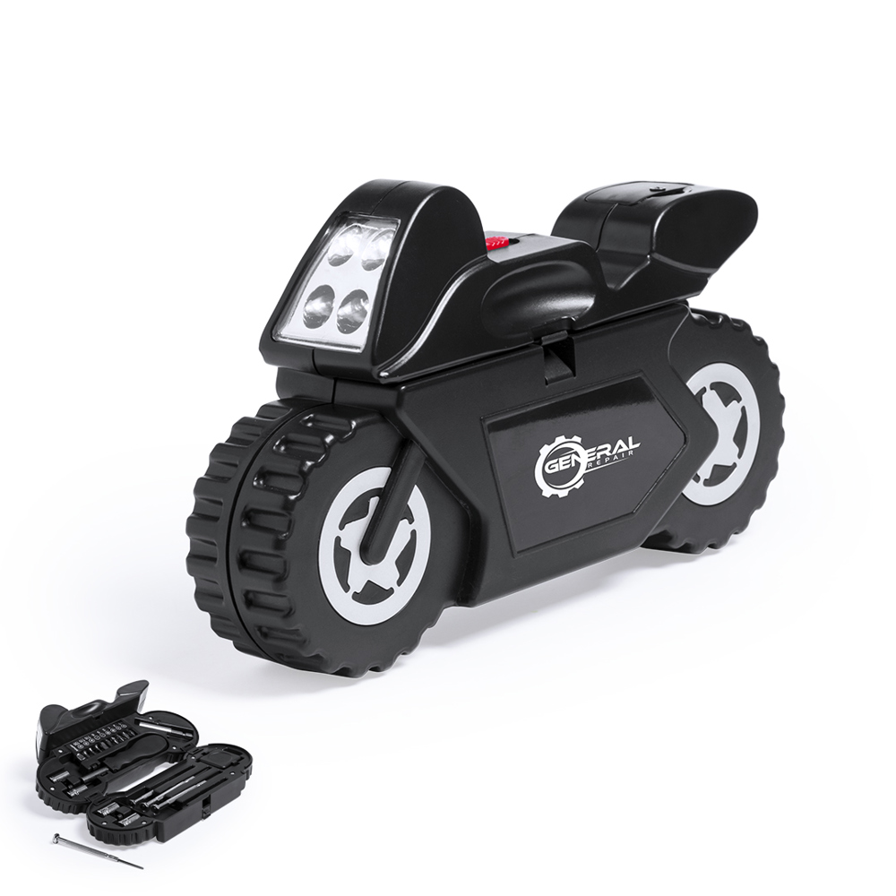 Tool set of 14 accessories in resistant case with motorcycle design, with built-in 4 LED flashlight. Includes set of precision screwdrivers, clamping tool, flat and crosshead screwdriver heads and wrenches for hexagonal nuts. Button cell batteries included. Presented in an individual box.